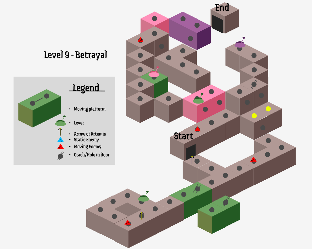 Core level elements include levers and moving platforms, line-of-sight-based enemies, ranged arrows for combat, and environmental hazards such as pitfalls and path-driven fire traps.